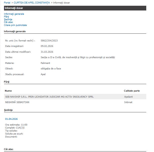 Un proces care a durat mai bine de doi ani și a trecut prin trei instanțe diferite, se pregătește de faza finală. Disputa juridică dintre firma în faliment Seb Navship SRL, reprezentată de lichidatorul judiciar MG Activ Insolvency SPRL, și pârâtul Sebastian Neghină a fost înregistrată oficial pe rolul Curții de Apel Constanța în data de 9 februarie 2026 (dosar 5862/254/2023).
