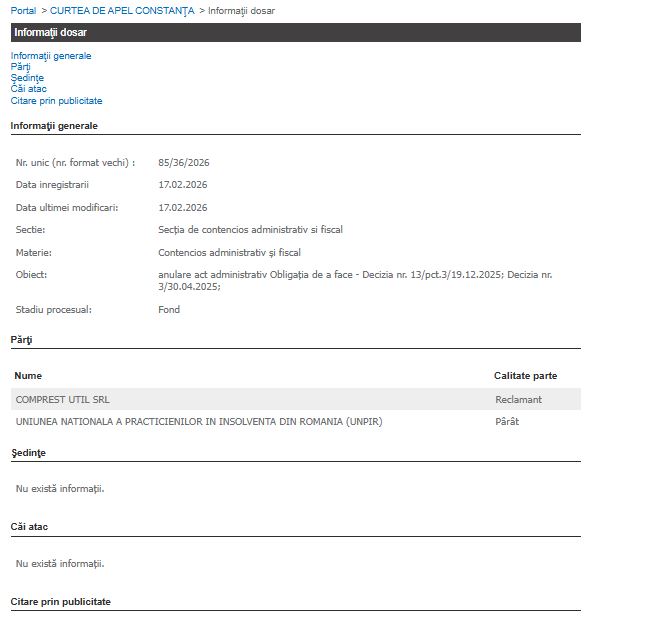 Curtea de Apel Constanța a fost sesizată recent într-un dosar de contencios administrativ și fiscal ce vizează activitatea Uniunii Naționale a Practicienilor în Insolvență din România (UNPIR). Reclamantul, societatea Comprest Util SRL, solicită magistraților anularea unor acte administrative emise.