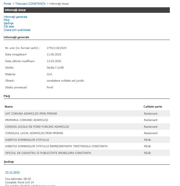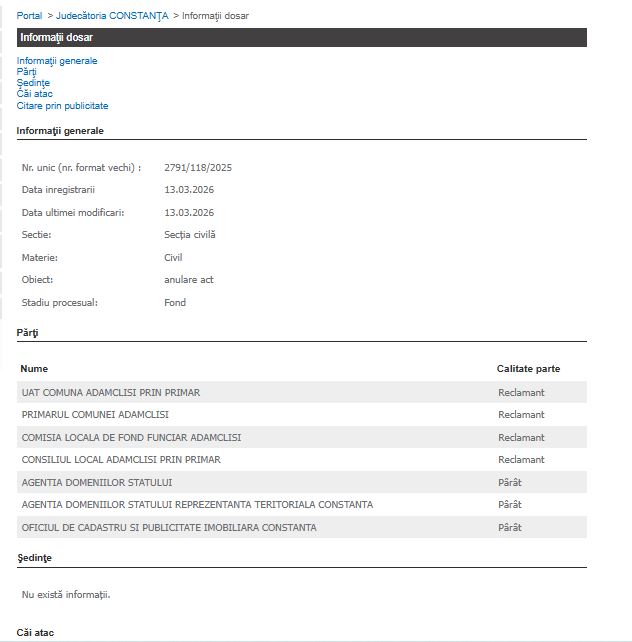 Conflictul juridic dintre autoritățile locale din Adamclisi și Agenția Domeniilor Statului (ADS) a intrat într-o nouă etapă procesuală. Dosarul nr. 2791/118/2025, înregistrat inițial pe rolul Tribunalului Constanța, a fost transferat recent către Judecătoria Constanța, după ce magistrații tribunalului au decis că nu au competența materială de a soluționa cauza.