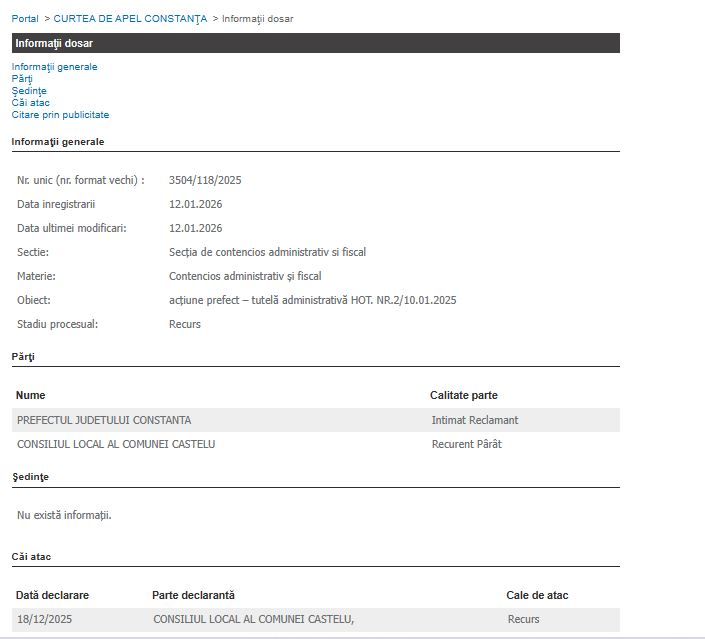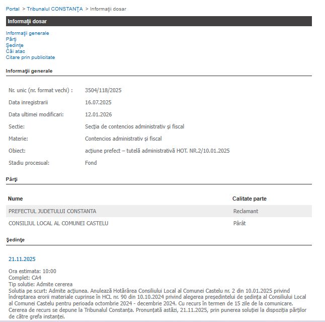 Dosarul 3504/118/2025 privește acțiunea prefectului județului Constanța împotriva Consiliului Local al Comunei Castelu, vizând anularea Hotărârii Consiliului Local nr. 2 din 10.01.2025, prin care se încerca „îndreptarea erorii materiale” din HCL nr. 90/10.10.2024 referitoare la alegerea președintelui de ședință al Consiliului Local.