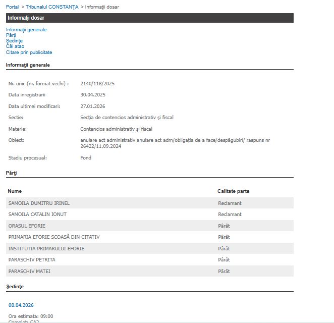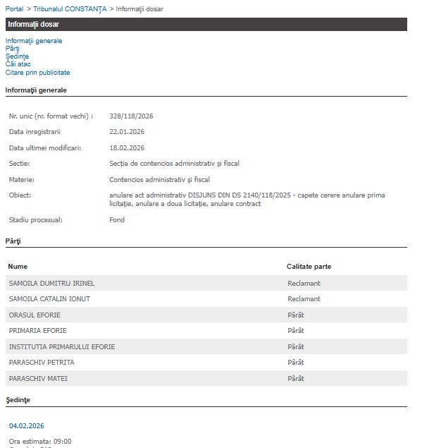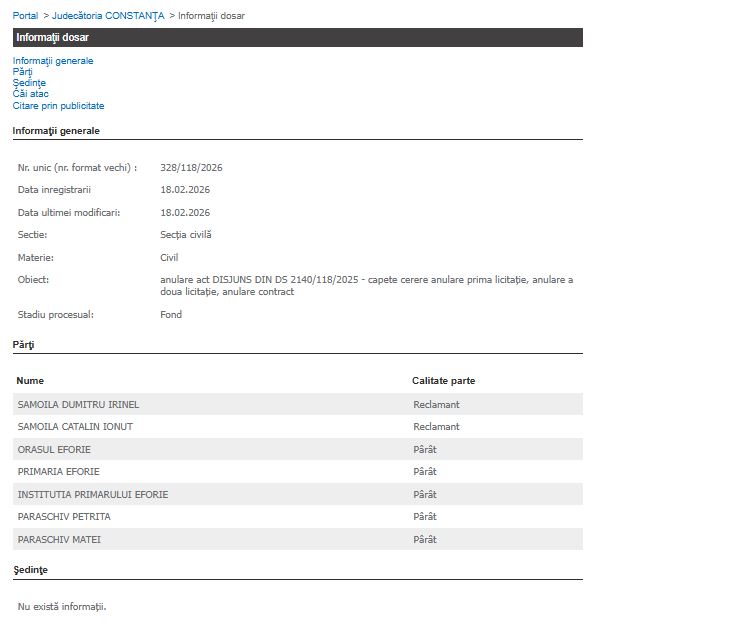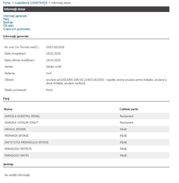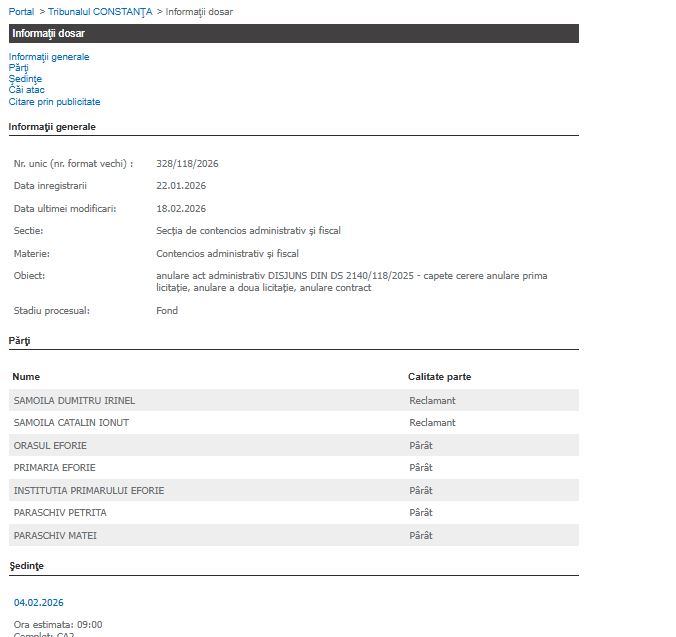 Dosarul 328/118/2026 se află pe rolul Judecătoriei Constanța, nou înregistrat. Este vorba despre judecarea anulării efective a licitațiilor și a contractului.