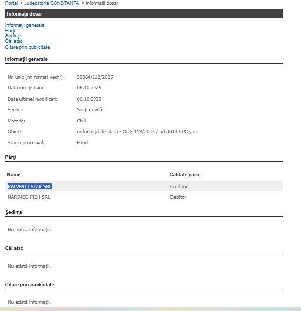 Dosarul cu numărul 30864/212/2025, aflat în prezent pe rolul Secției civile, a fost introdus de Ralverti Star SRL, în calitate de creditor, împotriva societății Narimed Fish SRL, care figurează în cauză ca debitor.