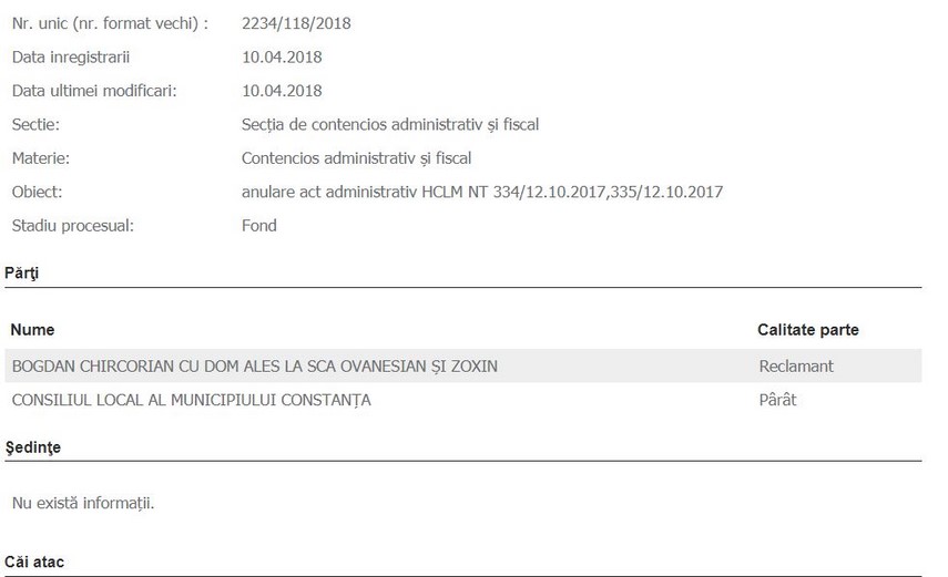 Un constănţean a atacat în instanţă două hotărâri ale Consiliului Local Municipal adoptate anul trecut. Prin intermediul dosarului 2234/118/2018, Bogdan Chircorian cere în contencios-administrativ anularea a două acte administrative care vizează obiectivul de investiţii „Joint Romania-Bulgaria Cultural and Historical heritage-Miniature Park“ - parcul de miniaturi din parcul Tăbăcărie. Este vorba despre anularea HCLM 334/12.10.2017, respectiv 335/12.10.2017.Este vorba despre hotărârea privind aprobarea indicatorilor tehnico-economici aferenţi obiectivului de investiţii, în faza documentaţiei tehnico-economice, a studiului de fezabilitate şi a memoriului tehnic, şi de hotărârea de Consiliu Local privind contribuţia proprie a Primăriei aferente proiectului.