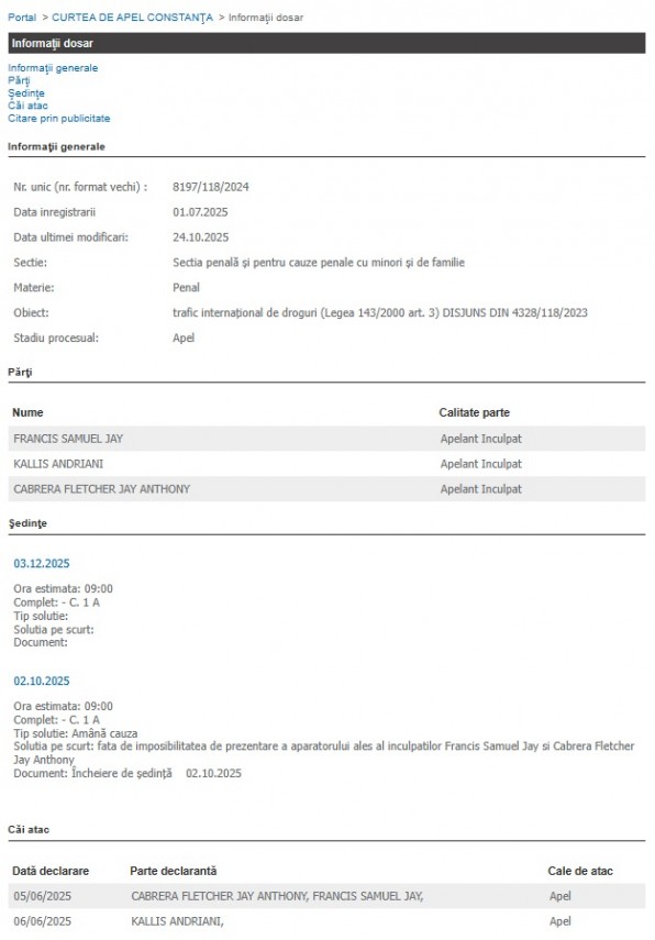 Potrivit portalului instanțelor de judecată, în dosarul cu indicativul 8197/118/2024, la începutul lunii iunie, anul curent, Tribunalul Constanța i-a condamnat pe Francis Samuel Jay, Kallis Andriani și Cabrera Fletcher Jay Anthony la câte-o pedeapsă de 13 ani și 4 luni de închisoare.