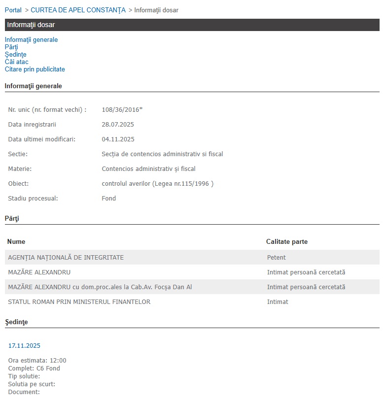 Potrivit portalului instanțelor de judecată, cauza a fost reînregistrată la data de 28 iulie 2025, sub numărul unic 108/36/2016, la Secția de contencios administrativ și fiscal, cu obiectul „controlul averilor”, conform Legii nr. 115/1996.