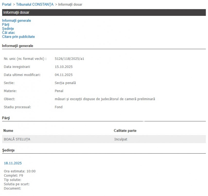 Potrivit Portalului Instanțelor de Judecată, marți, 18 noiembrie 2025, dosarul cu indicativul 5126/118/2025/a1, magistrații camerei preliminare din cadrul Tribunalului Constanța vor analiza rechizitoriul întocmit de procurori.
