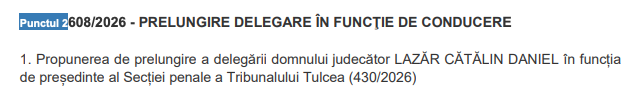 Mai precis, conform ordinii de zi, CSM îl propune pe judecătorul Lazăr Cătălin Daniel în funcția de președinte al Secției Penale din cadrul instanței.