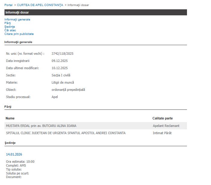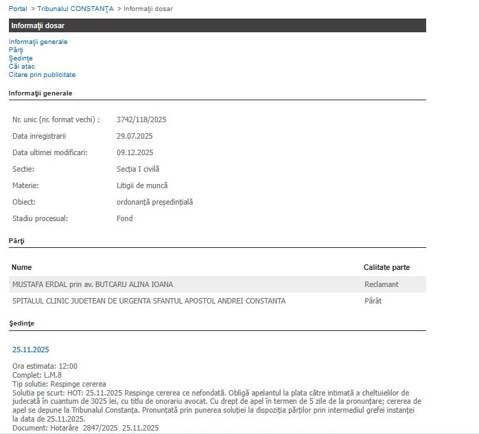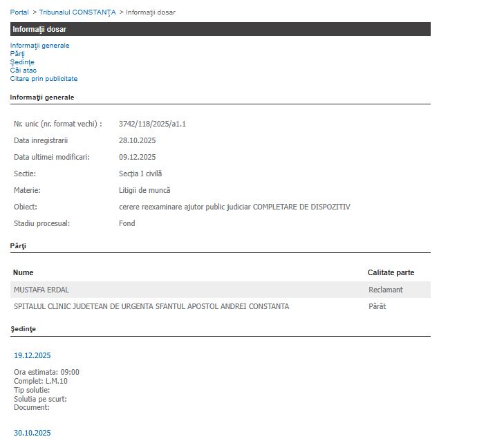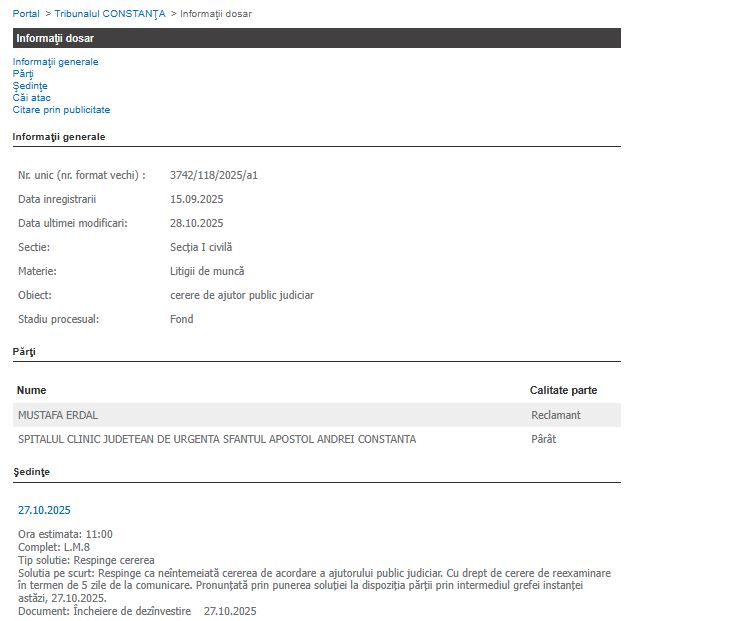 Tribunalul Constanța a admis cererea de ajutor public judiciar formulată de Mustafa Erdal, angajat implicat într-un litigiu de muncă cu Spitalul Clinic Județean de Urgență „Sfântul Apostol Andrei” Constanța în dosarul 3742/118/2025/a1. Reclamantului i-a fost desemnat un avocat din oficiu, cu un onorariu provizoriu de 940 lei, pentru reprezentarea în instanță.