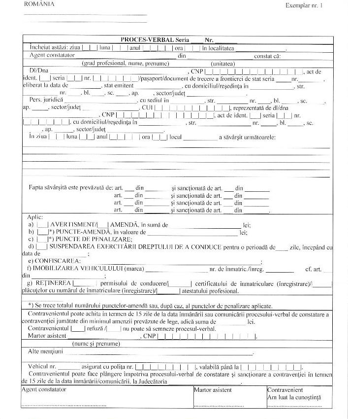 „Menţionăm că, în prezent, modelul procesului-verbal de constatare şi sancţionare a contravenţiilor este prevăzut în OUG nr. 195/2002 privind circulaţia pe drumurile publice, aprobat prin HG nr. 1391/2006. Datorită modificărilor legislative, procesul-verbal de constatare a contravenţiei este titlu de creanţă şi înştiinţare de plată, astfel că noul model de proces-verbal nu va mai cuprinde menţiuni cu privire la comunicarea înştiinţării de plată. De asemenea, vor fi inserate menţiuni cu privire la posibilitatea achitării în termen de 15 zile de la data înmânării sau comunicării procesului-verbal a jumătate din minimul amenzii prevăzute de lege“, conform sursei mai sus citate.
