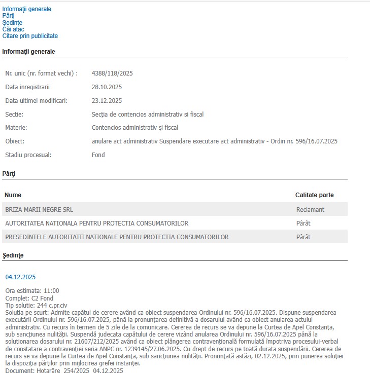 Briza Mării Negre SRL se află în litigiu cu ANPC. Societatea a dat în judecată Autoritatea pentru Protecția Consumatorului pentru anularea unui act administrativ, mai exact „Suspendare executare act administrativ - Ordin nr. 596/16.07.2025”.