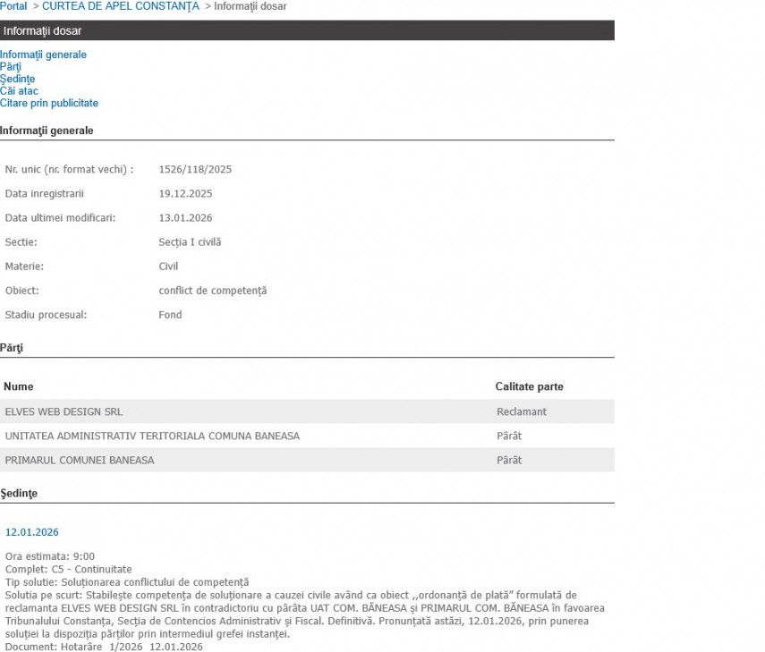 Curtea de Apel Constanța a decis Tribunalul Constanța va judeca litigiul dintre Elves Web Design SRL și Primăria Băneasa