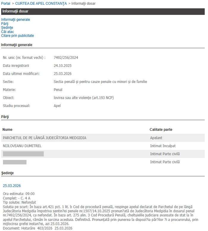 Curtea de Apel Constanța a anunțat verdictul miercuri, 25.03.2026, în cazul unui bărbat acuzat că și-a bătut iubita! Bărbatul a primit o pedeapsă de 2 ani și 9 luni de închisoare, în regim de detenție, iar decizia este definitivă!