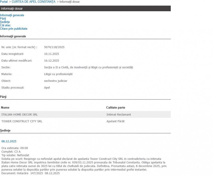 Pe 10 octombrie 2025, Tribunalul Constanța a înregistrat dosarul 5074/118/2025 în care reclamanta Italian Home Decor SRL a cerut măsura instituirii sechestrului judiciar față de pârâta Tower Construct City SRL.