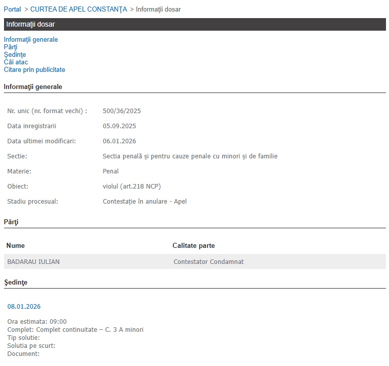 În cauză este vorba despre Bădărău Iulian, care, în primă instanță, a cerut achitare la Judecătoria Medgidia, însă la finalul lunii aprilie 2025 magistrații au respins cererea ca neîntemeiată, condamnându-l la 7 ani de închisoare.