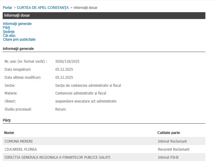 Această acțiune se suprapune unei alte spețe, mai vechi și de mare impact pentru comuna Mereni. Este vorba despre dosarul nr. 4094/118/2025, aflat în recurs la Curtea de Apel Constanța, înregistrat pe 7 noiembrie 2025.