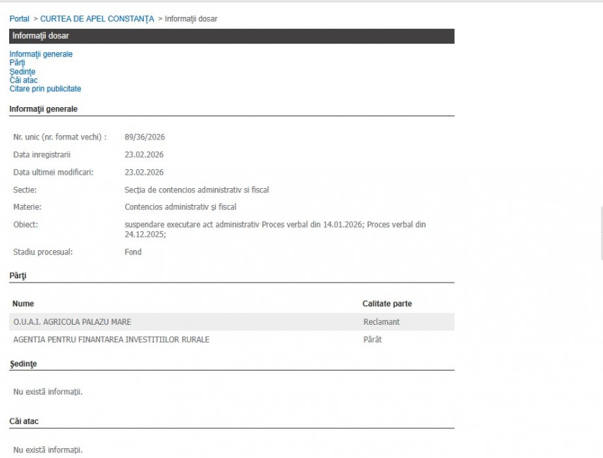 Pe rolul Curtea de Apel Constanța a fost înregistrat, la data de 23 februarie 2026, dosarul nr. 89/36/2026, având ca obiect suspendarea executării unor acte administrative.