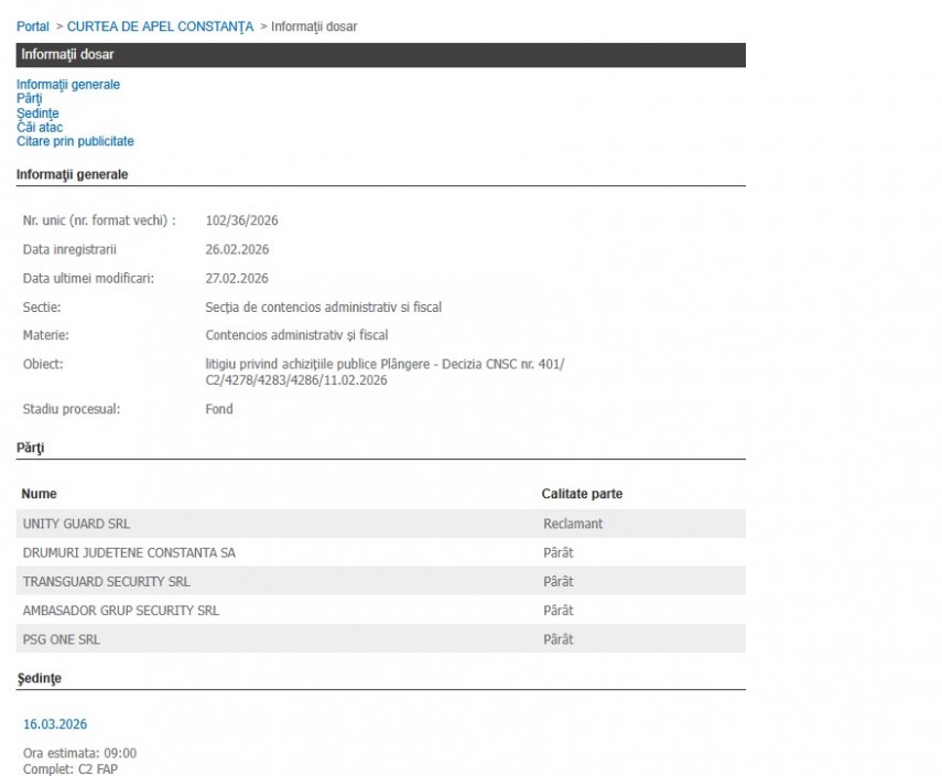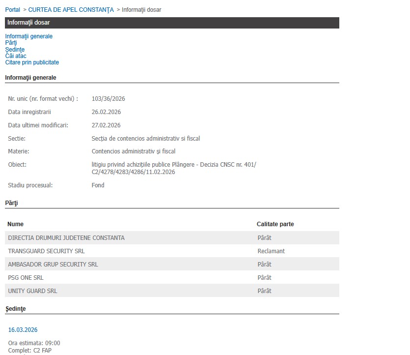 Al doilea proces, cu același obiect „litigiu privind achiziţiile publice Plângere - Decizia CNSC nr. 401/C2/4278/4283/4286/11.02.2026”, se află pe rolul Curții de Apel Constanța, în care reclamant este Transguard Security SRL.
