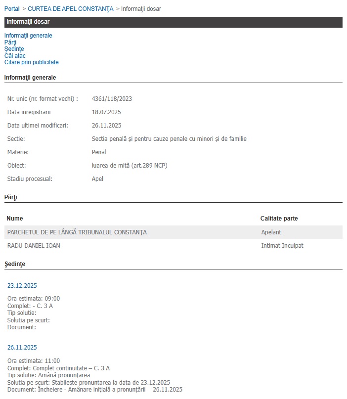 Inculpatul a contestat prima pedeapsă, iar astfel cauza a ajuns în atenția Curții de Apel Constanța, instanță care, la ultimul termen de judecată, din data de 26 noiembrie 2025, a rămas în pronunțare.