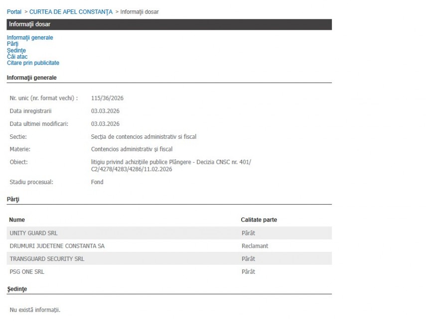 Astfel, la Curtea de Apel Constanța este înregistrat dosarul cu numărul unic 115/36/2026, din data de 03.03.2026 cu obiectul „litigiu privind achiziţiile publice Plângere-Decizia CNSC nr.401/C2/4278/4283/4286/11.02.2026”.