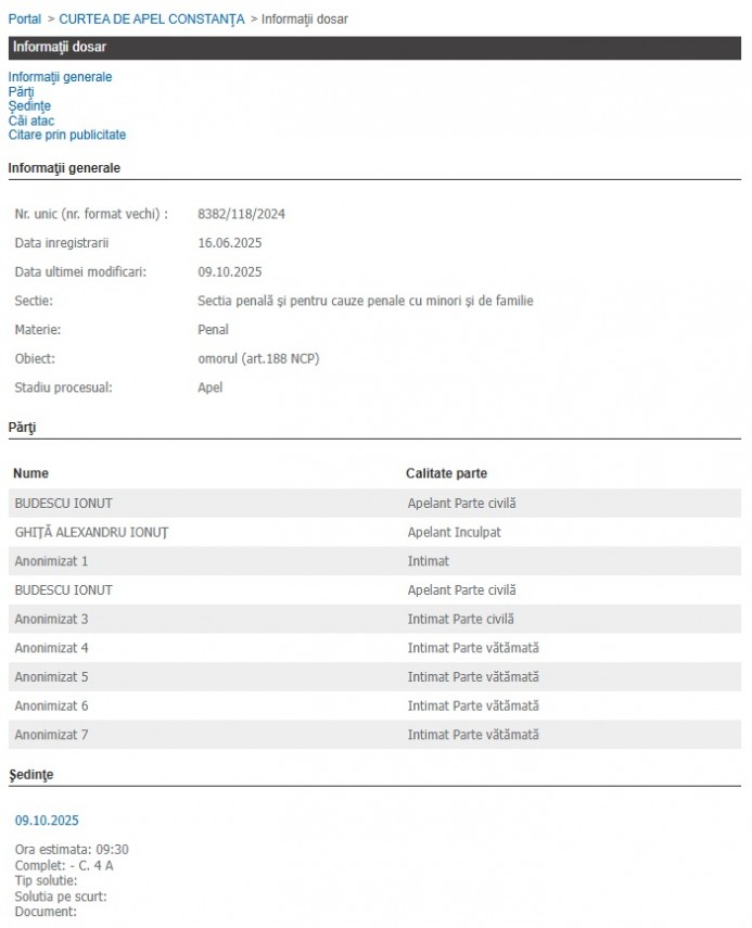 Inculpatul, pe nume Ghiță Alexandru Ionuț, aflat în arest preventiv la Penitenciarul Poarta Albă, a contestat prima condamnare, la jumătatea lunii mai 2025. Soluția a fost contestată, de asemenea, și de una dintre părțile civile, iar astfel cazul a ajuns în atenția instanței superioare.