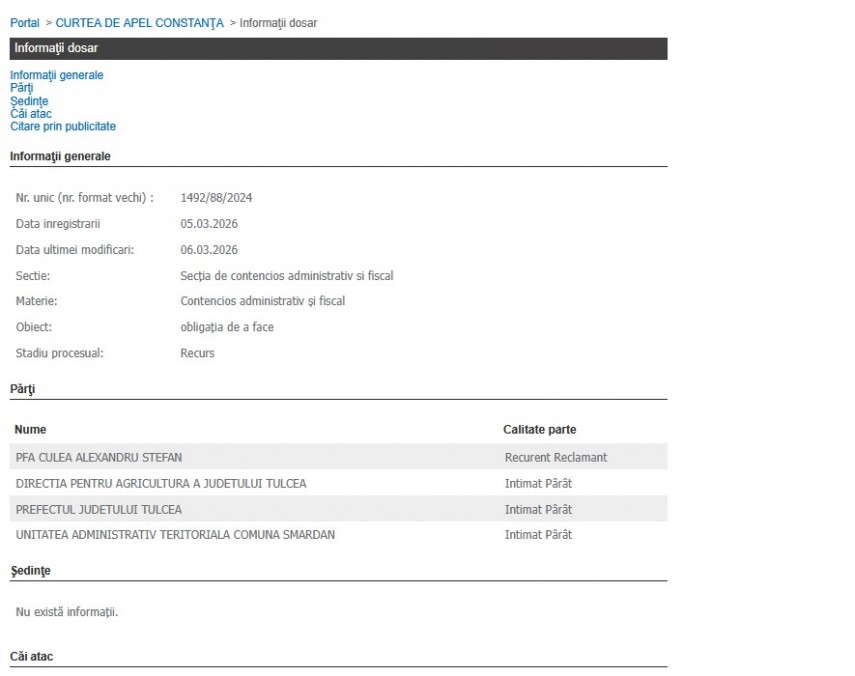 Pe rolul Curții de Apel Constanța a fost înregistrat dosarul nr. 1492/88/2024 care are ca obiect „ obligaţia de a face”. Stadiul procesual este recurs, la Secţia de contencios administrativ şi fiscal.