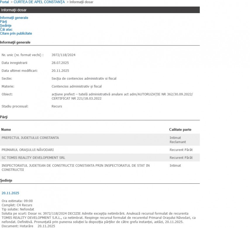 Astăzi, 20 noiembrie 2025, Curtea de Apel Constanța a stabilit termen pentru judecarea cauzei înaintate la data de 28 iulie a.c. pe rol, ca urmare a recursului formulat de Tomis Reality Development SRL și primarul orașului Năvodari.