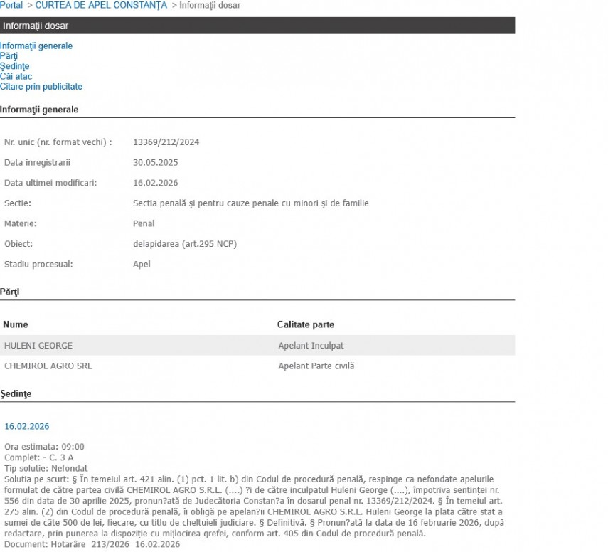 „Solutia pe scurt: În temeiul art. 421 alin. (1) pct. 1 lit. b) din Codul de procedură penală, respinge ca nefondate apelurile formulat de către partea civilă CHEMIROL AGRO S.R.L. (....) și de către inculpatul Huleni George (....), împotriva sentinţei nr. 556 din data de 30 aprilie 2025, pronunțată de Judecătoria Constanța în dosarul penal nr. 13369/212/2024. În temeiul art. 275 alin. (2) din Codul de procedură penală, îi obligă pe apelanții CHEMIROL AGRO S.R.L. Huleni George la plata către stat a sumei de câte 500 de lei, fiecare, cu titlu de cheltuieli judiciare. Definitivă. Pronunțată la data de 16 februarie 2026, după redactare, prin punerea la dispoziţie cu mijlocirea grefei, conform art. 405 din Codul de procedură penală.