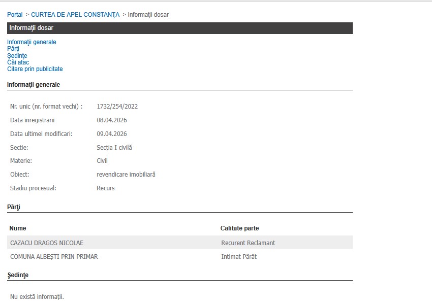 Dosarul se află pe Secţia I civilă, cu obiectul „revendicare imobiliară”, stadiul procesual fiind recurs. Nu s-a stabilit încă termen în proces.