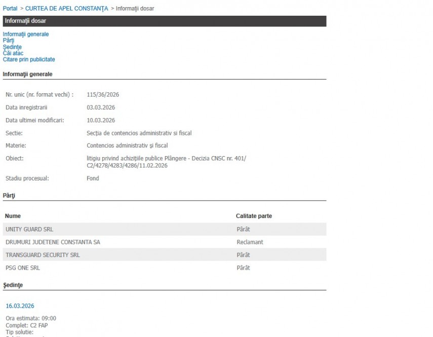 Totodată, la Curtea de Apel Constanța este înregistrat dosarul cu numărul unic 115/36/2026, din data de 03.03.2026 cu obiectul „litigiu privind achiziţiile publice Plângere-Decizia CNSC nr.401/C2/4278/4283/4286/11.02.2026”.
