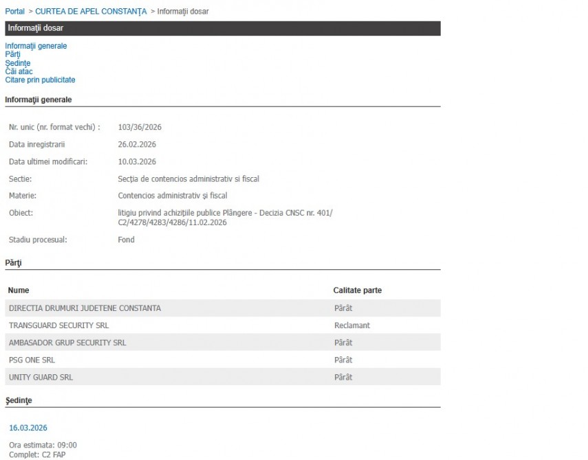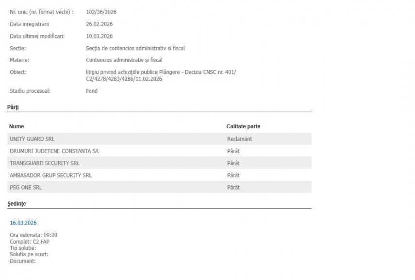 Al doilea proces, cu același obiect „litigiu privind achiziţiile publice Plângere - Decizia CNSC nr. 401/C2/4278/4283/4286/11.02.2026”, se află pe rolul Curții de Apel Constanța, în care reclamant este Transguard Security SRL.