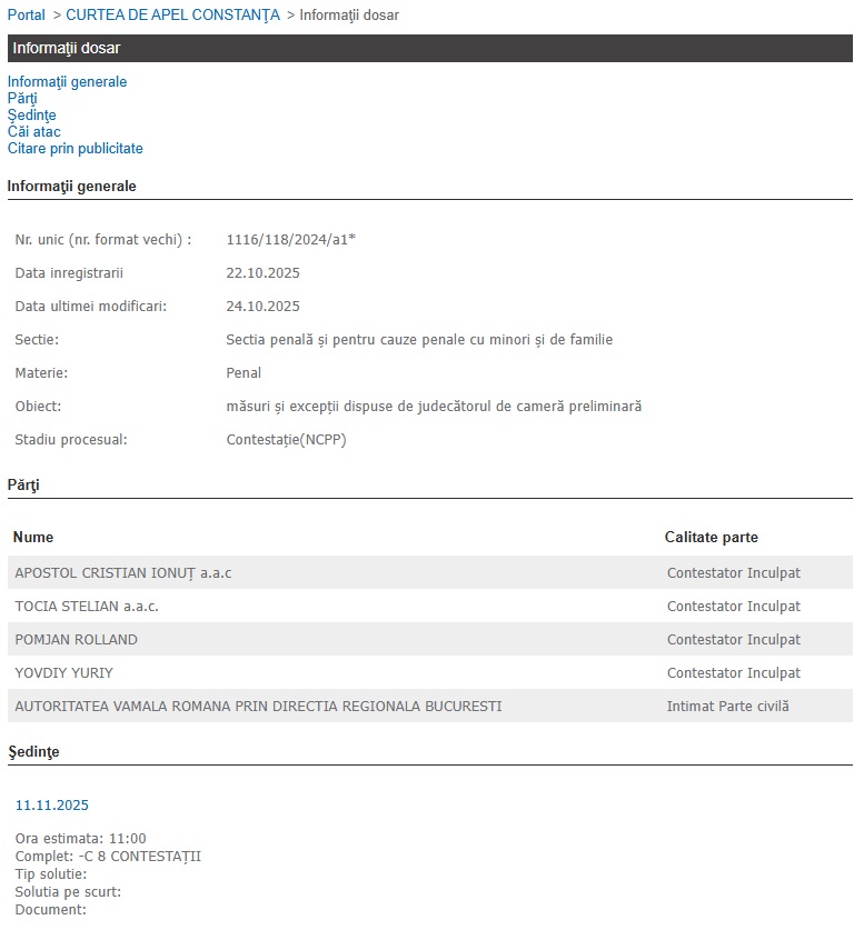 Conform Portalului instanțelor de judecată, magistrații vor analiza contestațiile la data de 11.11.2025.