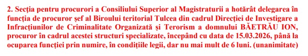 CSM a decis marți, 17 februarie 2026, în cadrul Ședinței pentru Procurori, delegarea magistratului Băetrău Ion în funcția de procuror șef al DIICOT Tulcea.