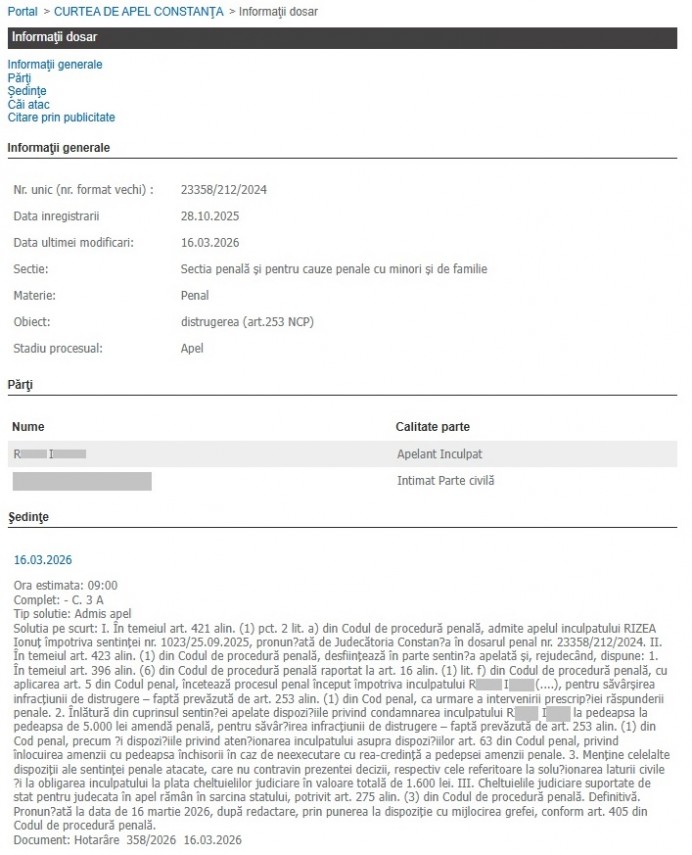 Curtea de Apel Constanța a anunțat luni, 16.03.2026, o decizie definitivă în cazul unui cetățean din Constanța acuzat că ar fi distrus mașina fiicei vecinei sale, totul, sub ochii copiilor minori ai persoanei vătămate.