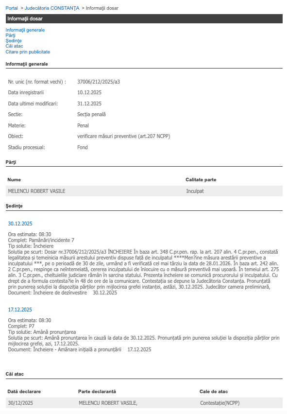 Potrivit Portalului Instanțelor de Judecată, marți, 30.12.2025, magistrații au stabilit ca Melencu Robert Vasile să rămână în arest preventiv.