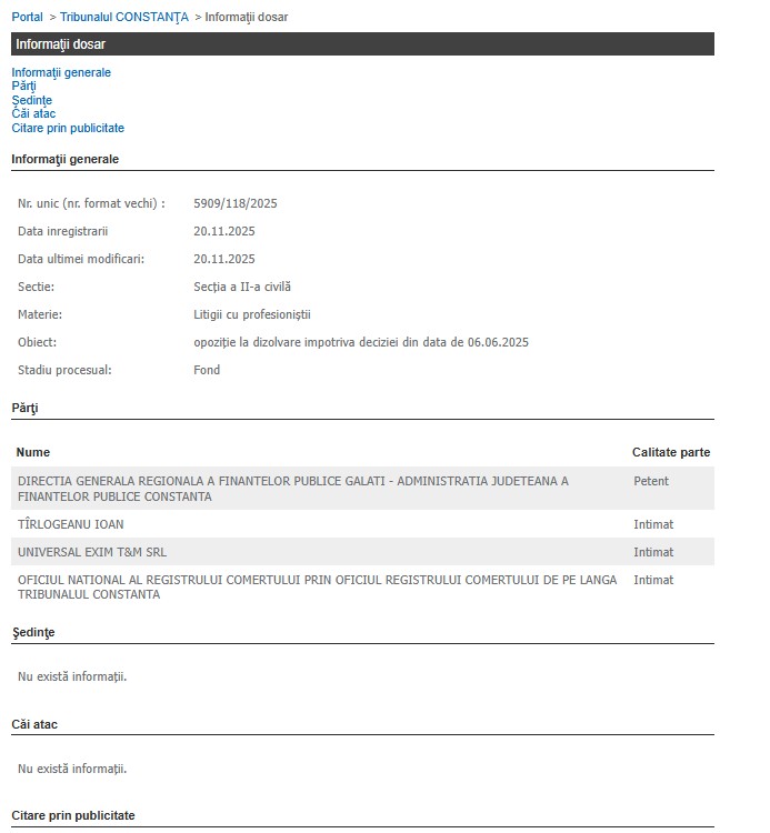Părțile din dosar sunt: Direcția Generală Regională a Finanțelor Publice Galați – Administrația Județeană a Finanțelor Publice Constanța – petent, Tîrlogeanu Ioan – intimat, Universal Exim T&M SRL – intimat, Oficiul Național al Registrului Comerțului, prin ONRC Constanța – intimat.