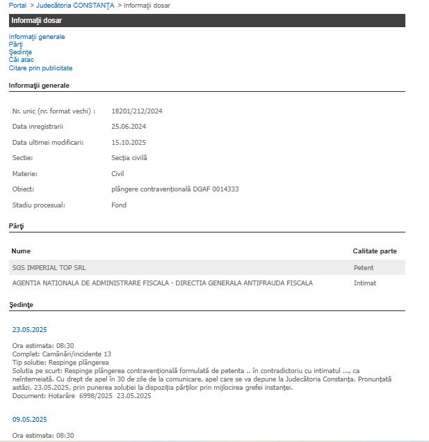 La data de 25 iunie 2024, societatea SGS Imperial Top SRL a înregistrat la Judecătoria Constanța o plângere contravențională împotriva Direcției Generale Antifraudă Fiscală din cadrul ANAF, solicitând anularea amenzii nr. DGAF 0014333.