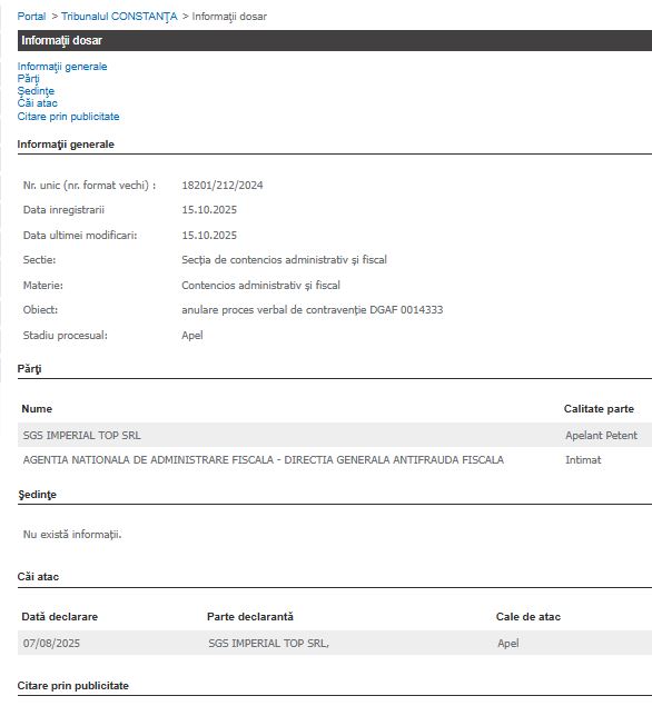 Ulterior, la data de 7 august 2025, societatea SGS Imperial Top SRL a declarat apel împotriva hotărârii pronunțate, dosarul fiind înregistrat la Tribunalul Constanța, de această dată la Secția de contencios administrativ și fiscal, cu același număr de dosar (18201/212/2024). Obiectul dosarului a fost reformulat ca anulare proces-verbal de contravenție DGAF 0014333, iar procesul se află în prezent în stadiul de apel, fără ca până la data de 15 octombrie 2025 să fi fost stabilită o primă ședință de judecată.