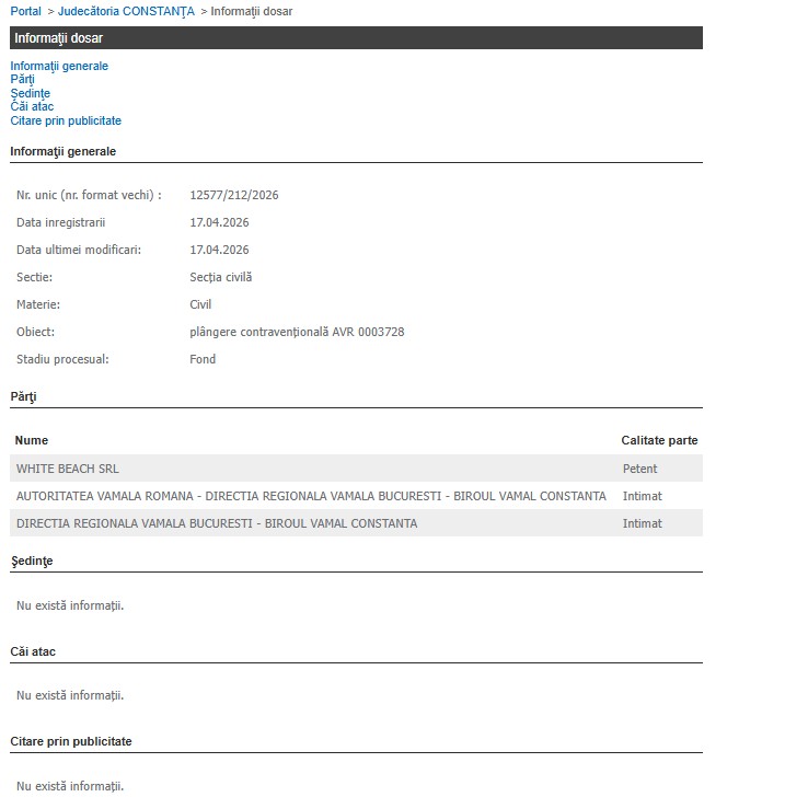 Societatea White Beach SRL din Constanța a atacat oficial în instanță o decizie a Autorității Vamale Române, înregistrând vineri, 17 aprilie 2026, o plângere contravențională la Judecătoria Constanța.