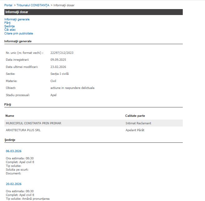 Tribunalul Constanța a programat pentru data de 20 februarie 2026, un nou termen în procesul dintre Municipiul Constanța, reprezentat prin Primar, și societatea Arhitectura Plus SRL.