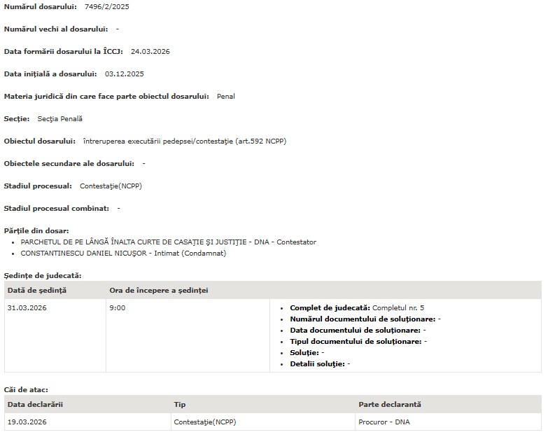 Potrivit Portalului Instanțelor de Judecată, contestația a fost înregistrată la data de 19.03.2026 și va fi examinată de magistrații Înaltei Curți de Casație și Justiție marți, 31 martie, anul în curs.