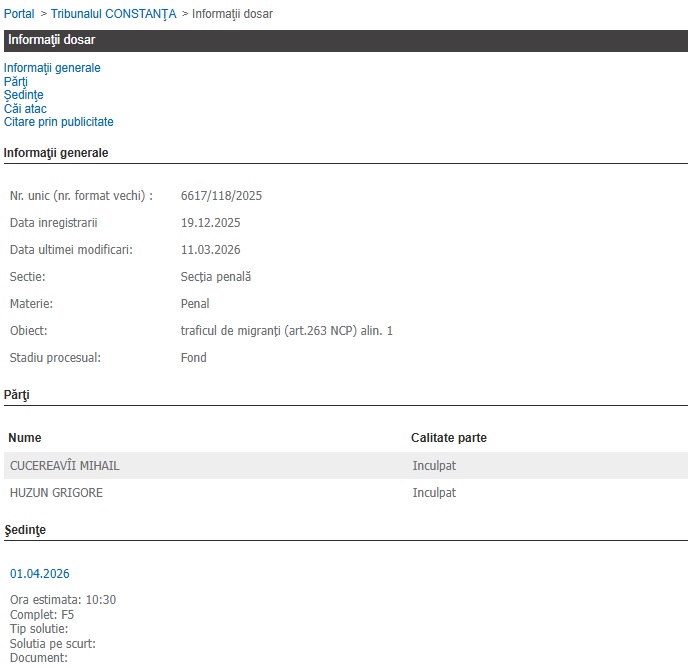 Cei doi inculpați sunt cercetați în dosarul cu indicativul 6617/118/2025, înregistrat pe Secția Penală a Tribunalului Constanța, care are ca obiect traficul de migranţi (art.263 NCP) alin. 1.