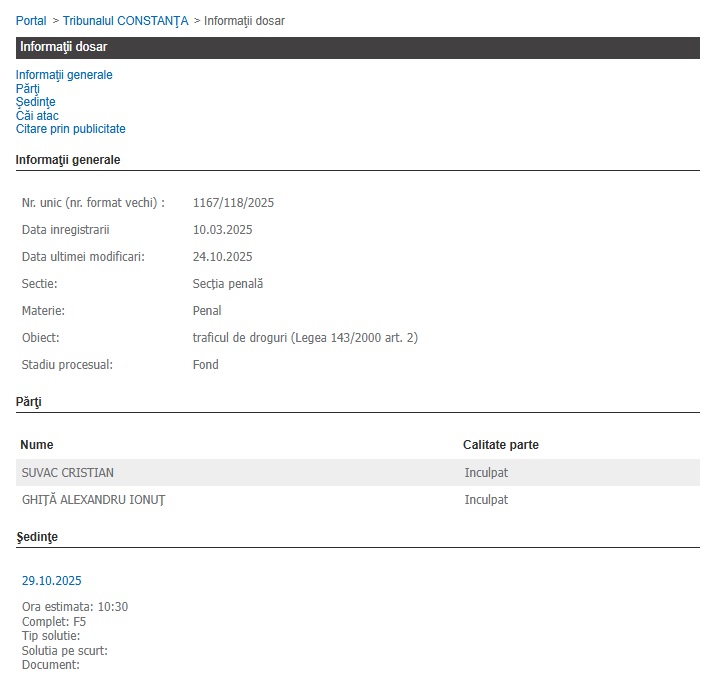 La Tribunal s-a desfășurat miercuri, 29.10.2025, primul termen într-un dosar de trafic de droguri de mare risc, instrumentat de Serviciul Teritorial Constanța din cadrul Direcției de Investigare a Infracțiunilor de Criminalitate Organizată și Terorism (DIICOT), la care au fost citați doi inculpați.