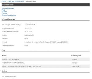 Amintim că pe 16 mai 2024, pe rolul Secției penale a Tribunalului Constanța a fost înregistrat dosarul cu numărul unic 3370/118/2024, cu obiect „infracţiuni de evaziune fiscală”.