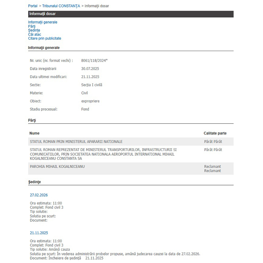 - Tribunalul Constanța a stabilit un nou termen într-un dosar de expropriere, aflat în rejudecare, a unei parcele de teren intravilan din județul Constanța, în care Parohia Mihail Kogălniceanu a chemat în judecată Ministerul Apărării Naționale, precum și Ministerul Transporturilor!