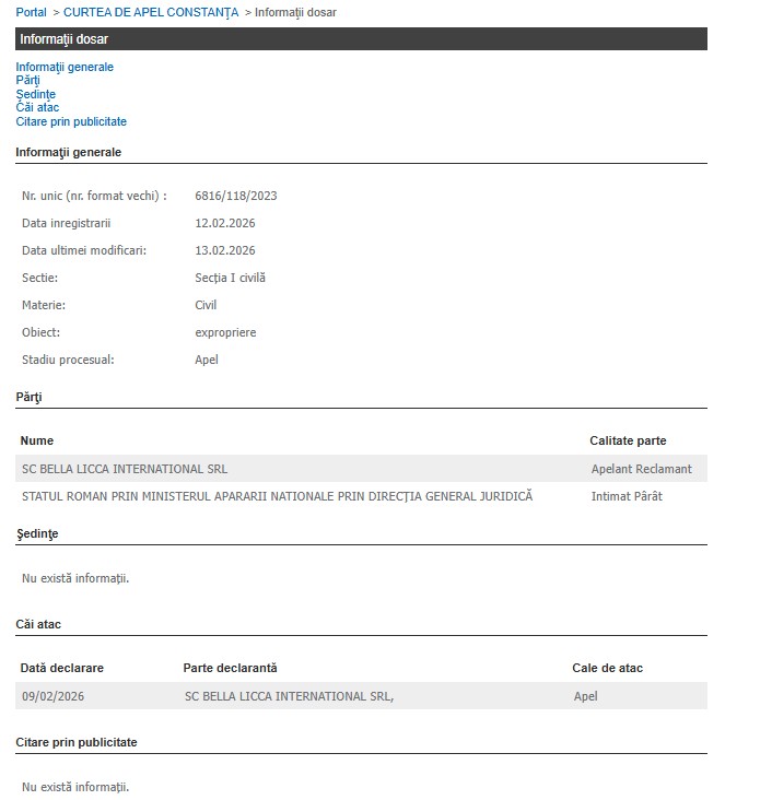 Deși soluția a fost pronunțată la finalul anului 2025, procesul continuă, Bella Licca International SRL depunând apel în data de 9 februarie 2026.Soluția pe scurt: Admite în parte cererea formulată de reclamanta Bella Licca International S.R.L. CUI ... cu sediul în ..., în contradictoriu cu pârâtul Statul Român prin Ministerul Apărării Naţionale, cu sediul în .... Obligă pârâtul să plătească reclamantei suma de 4.438 lei lei reprezentând diferenţa dintre despăgubirile cuvenite şi cele achitate pentru exproprierea terenului în suprafaţă de 5000 metri pătraţi situat în intravilanul .... Obligă pârâtul la suportarea cheltuielilor de judecată pricinuite reclamantei, respectiv la plata către aceasta a sumei de 4.500 lei, reprezentând onorariul experţilor, şi a sumei de 7.140 lei, onorariul de avocat. Cu drept de recurs în termen de 30 de zile de la comunicare.