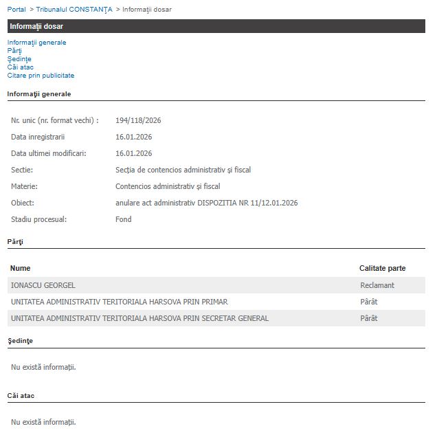 Conform datelor oficiale de pe portalul justiției, reclamantul Ionașcu Georgel a acționat în instanță Unitatea Administrativ Teritorială (UAT) Hârșova, chemând în proces atât Primarul, cât și Secretarul General al localității. Obiectul litigiului este „anulare act administrativ”, fiind vizată în mod direct Dispoziția nr. 11, emisă pe data de 12 ianuarie 2026.