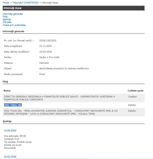 Magistrații Secției a II-a Civilă din cadrul Tribunalului Constanța au dispus termen astăzi, 22 aprilie 2026, în dosarul privind deschiderea procedurii de faliment împotriva debitoarei Cris Thias SRL.
