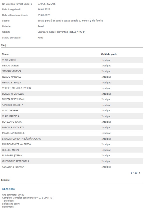Mai precis, potrivit Portalului Instanțelor de Judecată, magistrații vor stabili analiza dosarul cu indicativul 639/36/2025/a6, care are ca obiect verificare măsuri preventive (art.207 NCPP).