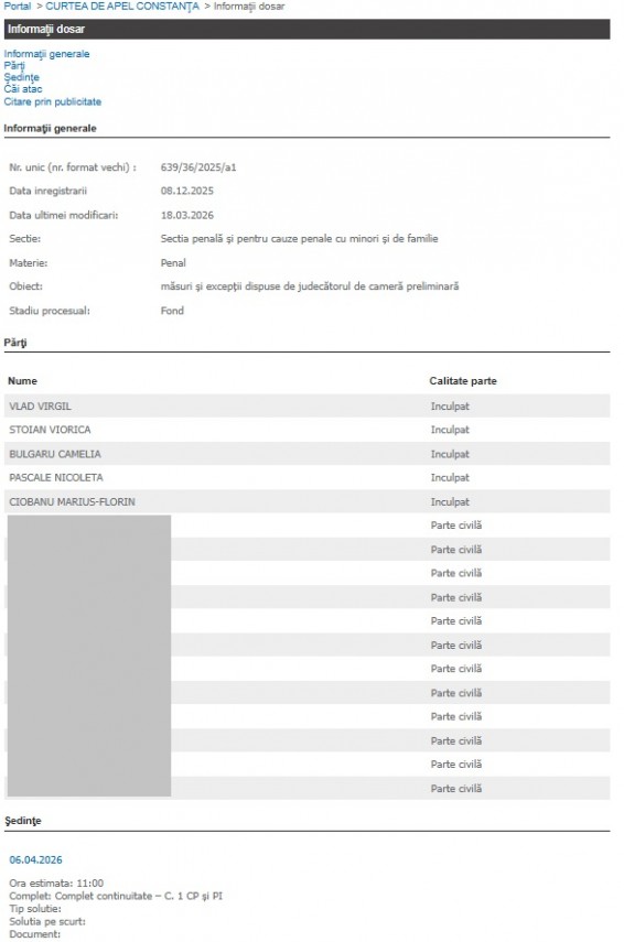 Un termen crucial are loc astăzi, 06 aprilie 2026, la Curtea de Apel Constanța, în dosarul denumit generic „Fabrica de Moșteniri”, în care 26 de inculpați au fost trimiși în judecată!