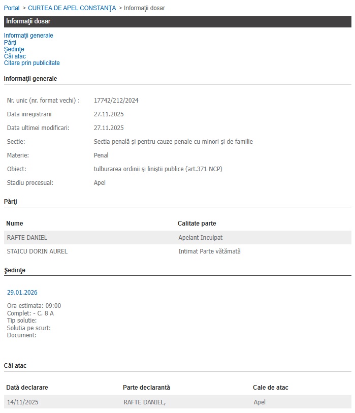 - Dosarul în care Daniel Rafte a fost trimis în judecată, după un incident în trafic, în municipiul Constanța, este pe cale să fie soluționat! Cauza se află în atenția Curții de Apel Constanța, care a stabilit termen de judecată la sfârșitul lunii ianuarie, anul viitor.